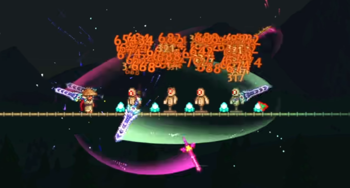 天顶剑无疑是所有武器中当之无愧的王者。它不仅伤害爆炸,还能自动追踪敌人,穿墙攻击,让你在面对任何敌人都能轻松应对。要合成这把神器,咱们得先收集一大堆材料,包括泰拉刃、彩虹喵之刃、狂星之怒等强力武器,最后在秘银砧或山铜砧旁边合成。过程虽然复杂,但为了它的逆天性能,绝对值得一试!